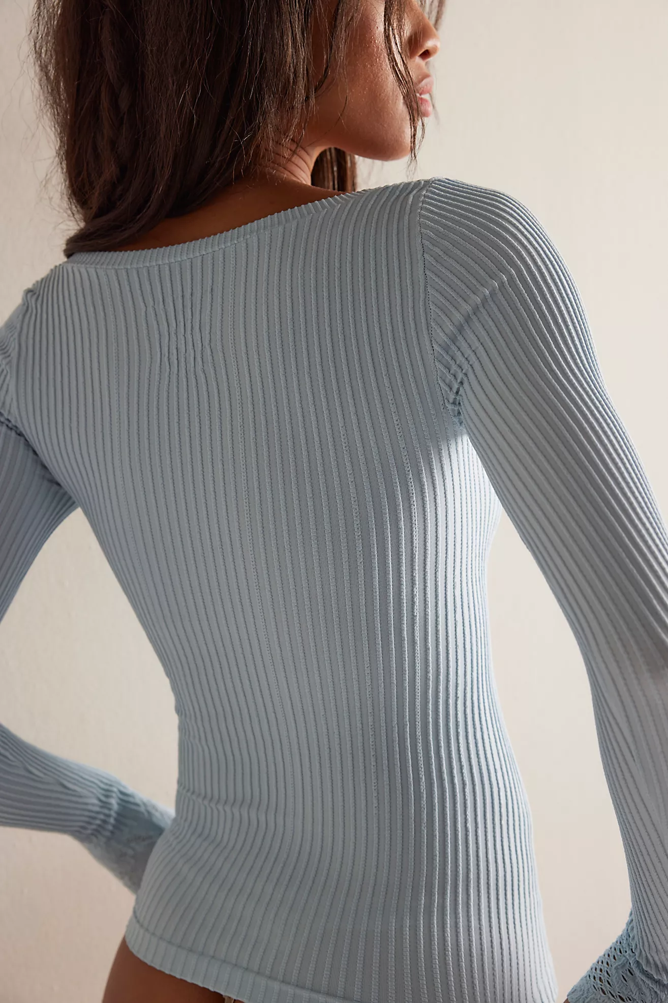 Create an accountTexture is everything with this oh-so flattering long sleeve from Intimately, featured in our signature stretchy seamless fabrication with a ribbed finish, open-knit details, and a lace-like chest accent.