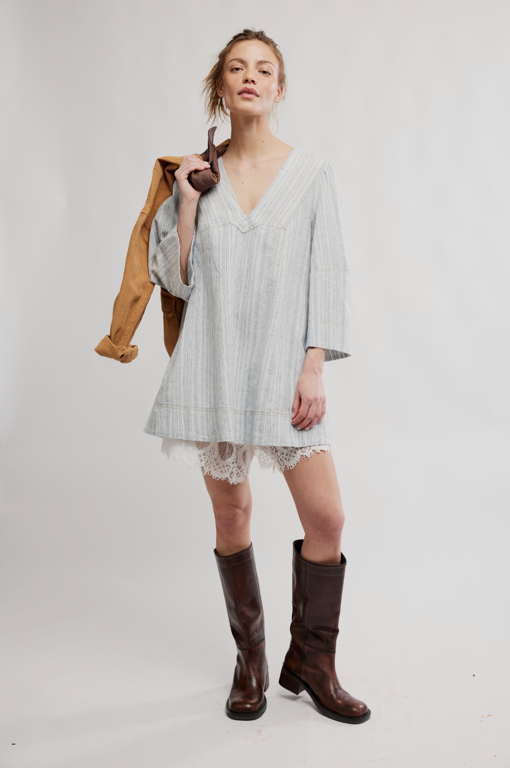 Create an accountEffortlessly versatile, this long sleeve linen knit mini dress combines textured comfort with understated elegance. Rendered in a soft indigo blue with subtle striping, it features a flattering plunging V neckline that adds refined allure. Transition seamlessly from day to evening—pair it with denim shorts for a casual look, layer it over swimwear as a poolside cover-up, or wear it solo for an effortlessly chic ensemble. The relaxed fit and natural linen blend ensure breathable comfort whether you're dressing up or down.