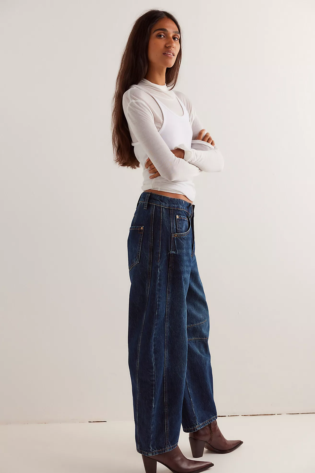 Create an accountSo bold barrel jeans featured in a mid-rise fit with subtle distressed detailing and wide-legs that taper at the ankle.