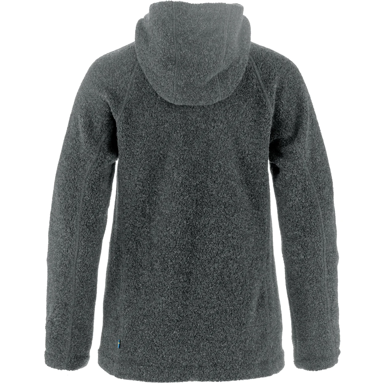 Comfortable fleece with snug hood and rippled surface. Made from a functional wool blend that combines the temperature-regulating properties of wool with the durability of polyester. Can be worn both as a warm, moisture-wicking middle layer under a shell jacket and when relaxing after a trek. Snug hood with microfleece lining that is soft against the cheek. Full-length zipper in the front with protective flap at the chin. Two zippered side pockets.