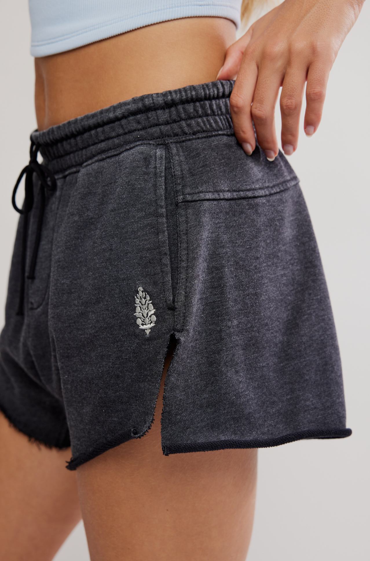 Features: French terry fabrication; mid-rise silhouette; adjustable drawstring at elasticized waistband; slip pockets; split hemline; raw-edge detailing; embroidered buti logo.