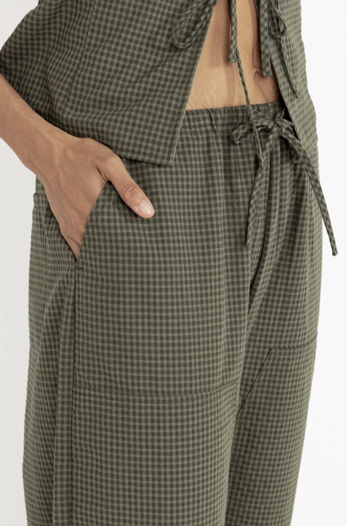 Create an accountThe Louise Check Drawstring Pant in Olive merges relaxed comfort with tailored details. A mid-rise fit, straight-leg silhouette, and front patch pockets make it a must-have for casual wear.