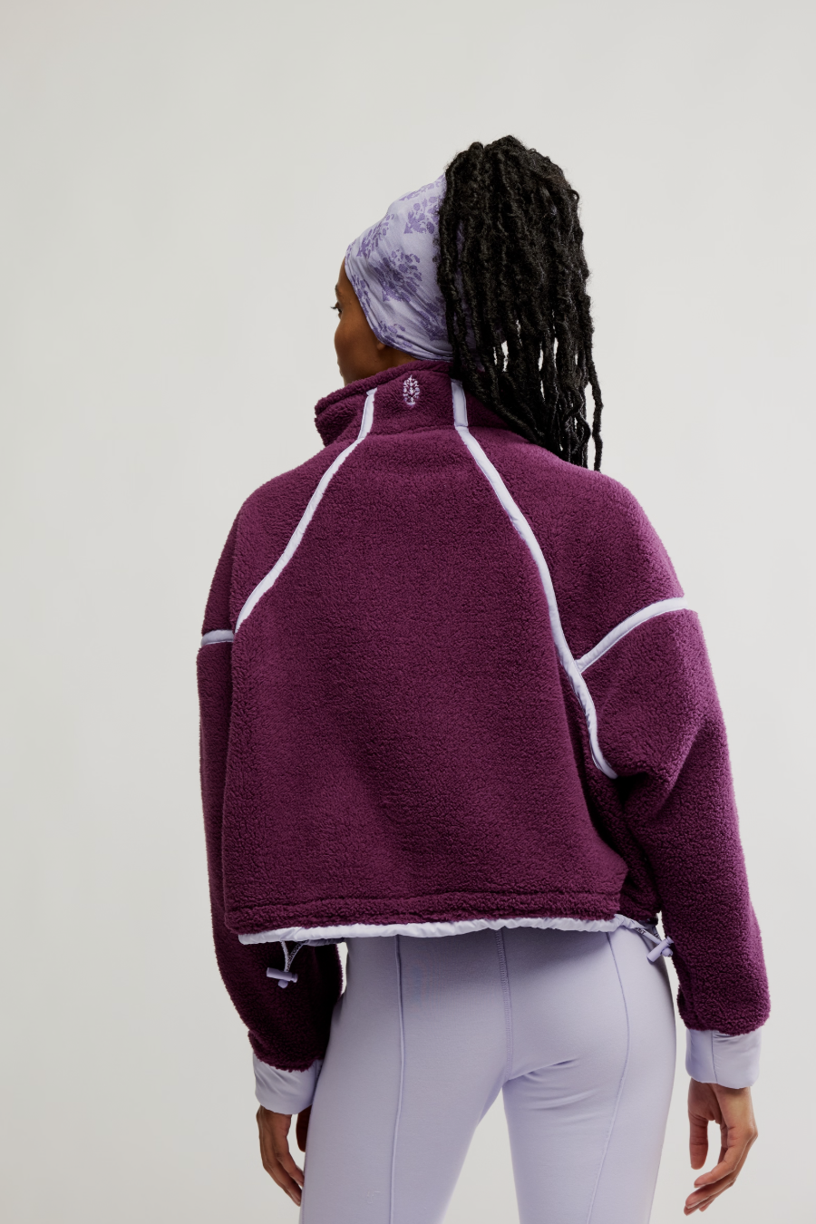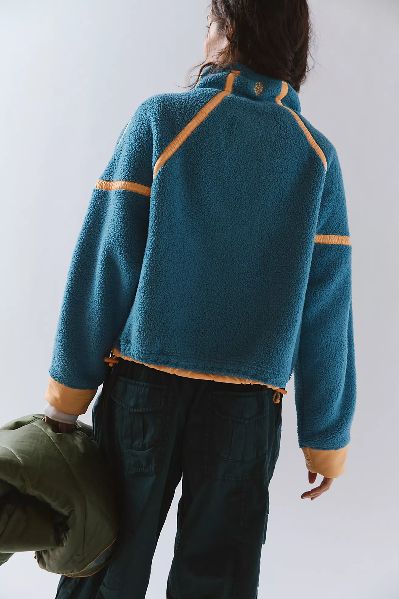 Zippered pockets at front, high-neckline with a half-zip closure, drop-shoulder sleeves, drawcord at bottom hem for adjustability, nylon cuffs