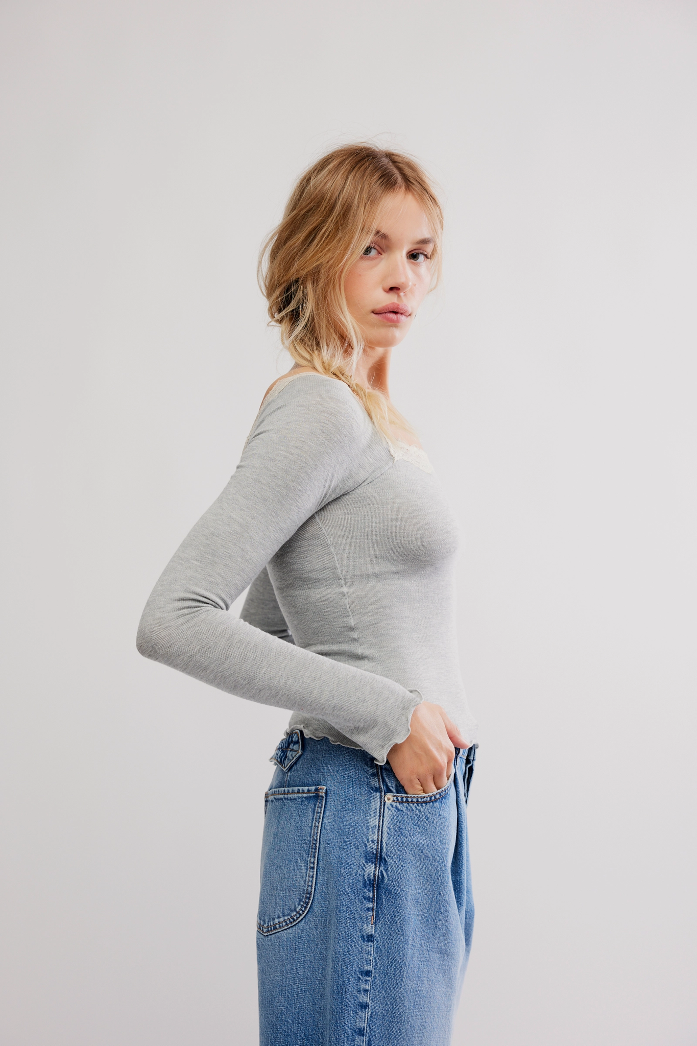 Create an accountThe perfect light-as-air long sleeve from our Oh My Darling collection, this essential top features a soft micro rib with delicate lace piecing at the neck and lettuce edged trimming for added dimension.