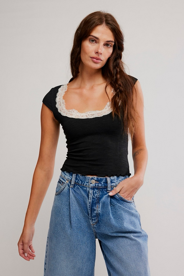 Create an accountIntricate lace adorns the neckline of this flattering tee from Intimately, featuring a wide square neckline with capped short sleeves and lettuce-edge trim.