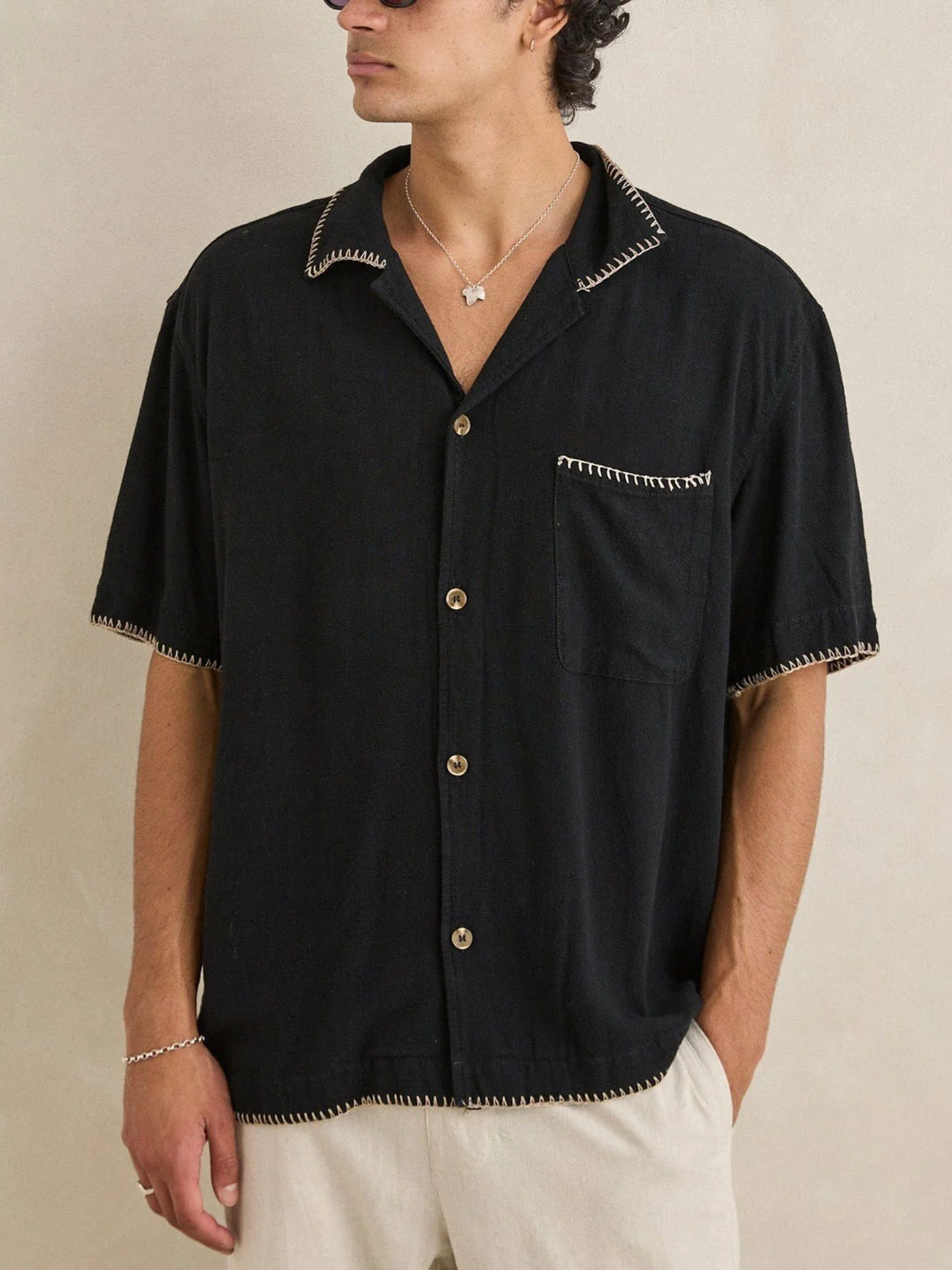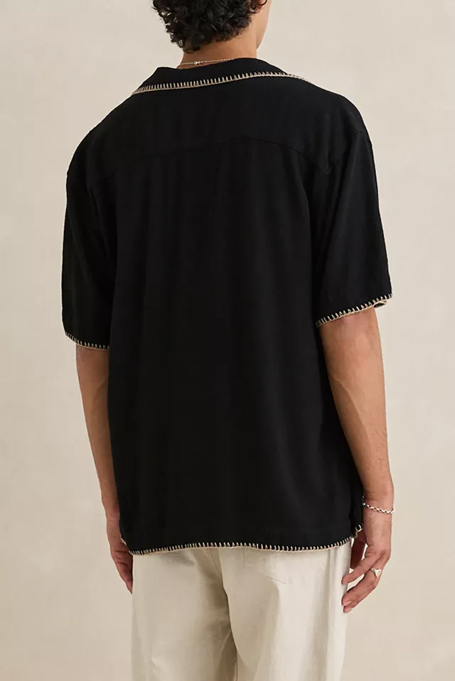Create an accountRelaxed through the body with laid-back whip stitch detailing, this short sleeve shirt features a Cuban collar, straight hem, and lightweight finish for everyday styling.