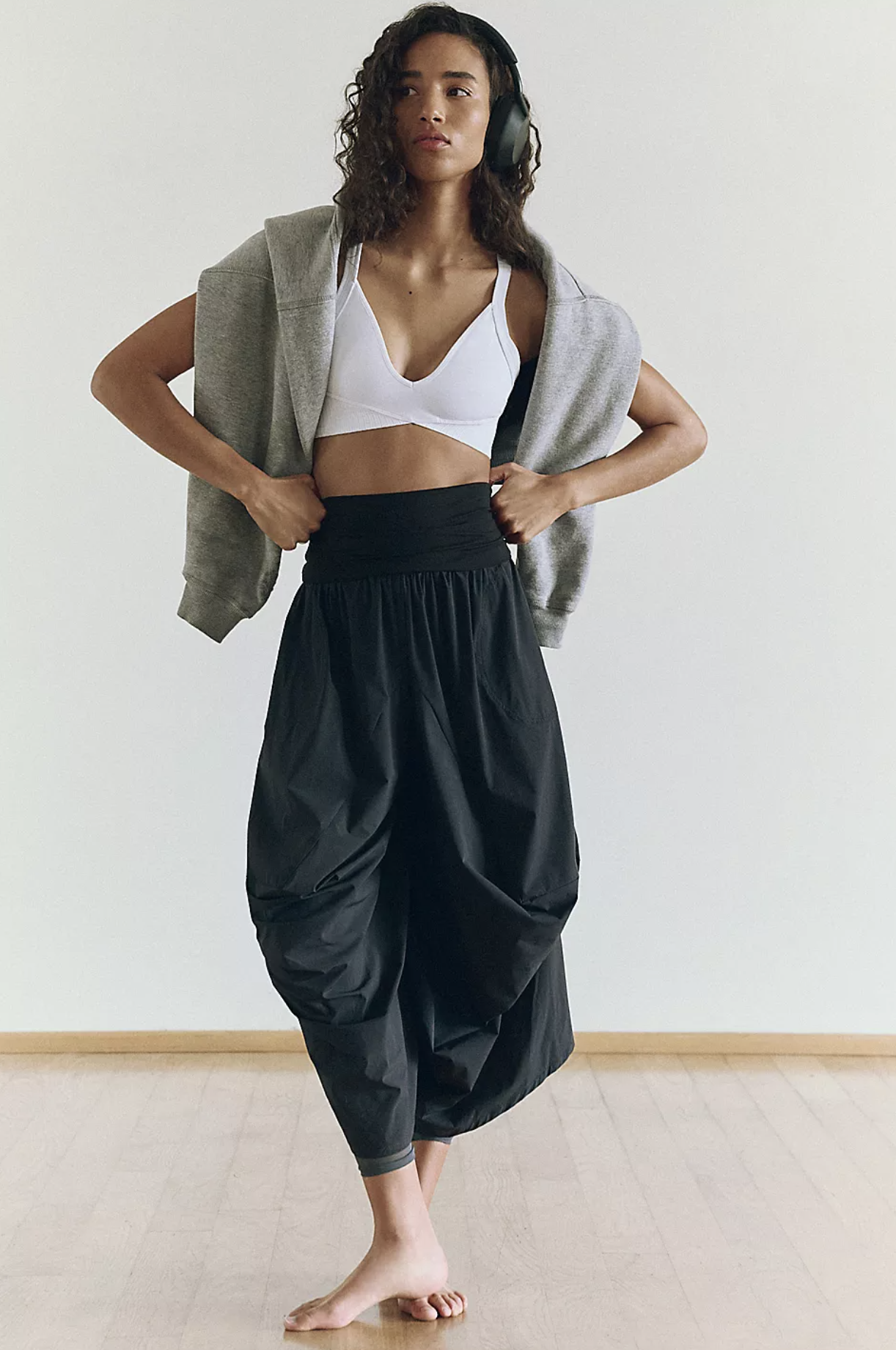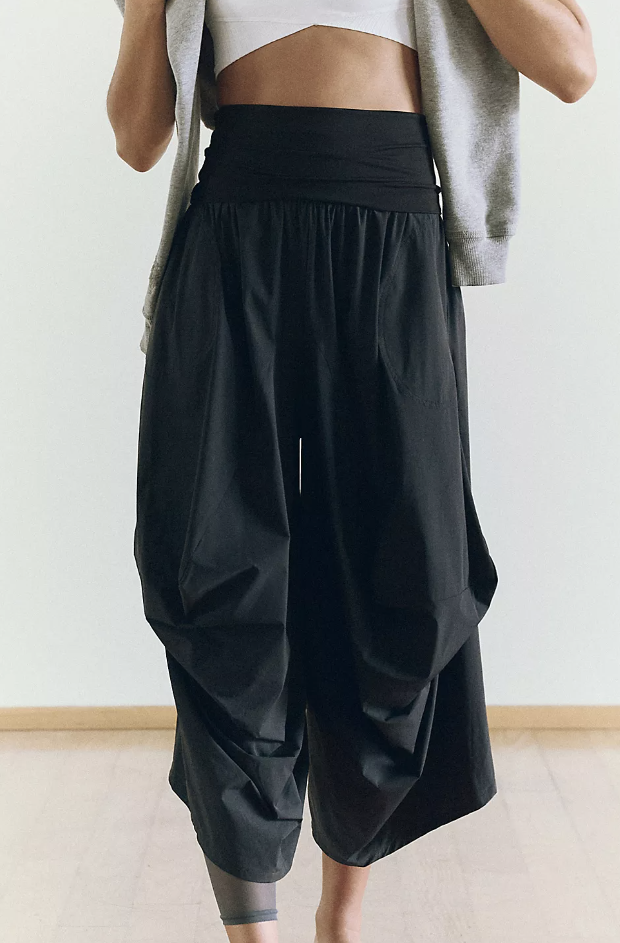 Features: Convertible design; fitted panel at top; exaggerated, gather-adorned legs; side pockets; slightly cropped fit.